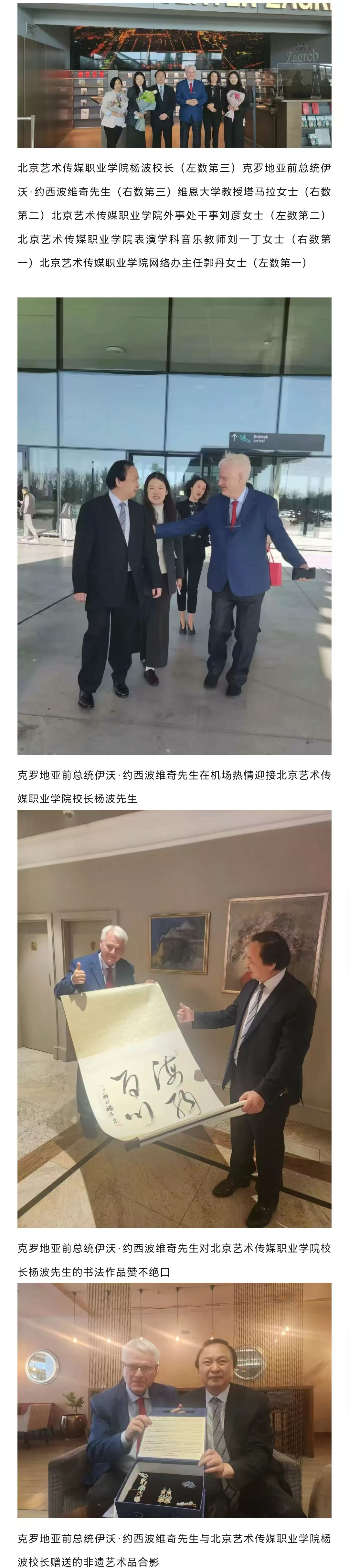 金秋的克罗地亚首都萨格勒布,天朗气清。当地时间4日上午10时,杨波校长一行四人抵达萨格勒布机场,受到克罗地亚前总统、维恩大学名誉教授、北京艺术传媒职业学院外籍顾问伊沃·约西波维奇先生的热烈欢迎。维恩大学教授塔马拉等一同到机场迎接。