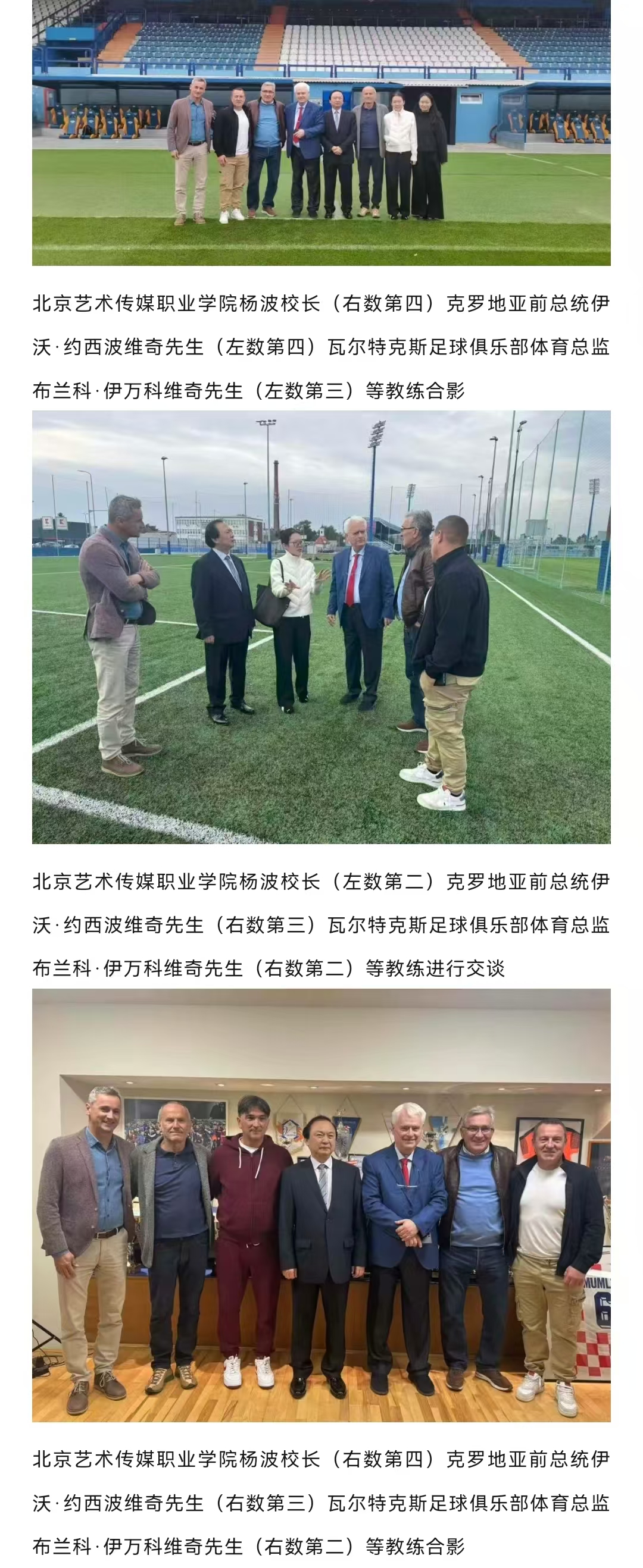 杨波校长首先阐述了此次访问的三大重要意义:一是为具体落实“一带一路”倡议中关于文化、教育、体育交流与合作的相关精神,他特别感谢约西波维奇先生及各方为此所付出的卓有成效的努力。二是希望在北京艺术传媒职业学院外籍顾问伊沃·约西波维奇先生、博鲁特·帕霍尔先生、姆拉登·伊万尼奇先生等杰出人士的持续支持下,共同为提升北京艺术传媒职业学院的办学层次和国际化水平注入新动力。三是介绍北京艺术传媒职业学院未来的学科发展规划,特别是计划开设体育学科足球专业,旨在探索合作建立“中克足球中心”,为振兴中国足球事业贡献力量,并将其置于服务国家教育发展和体育强国战略的大局中。