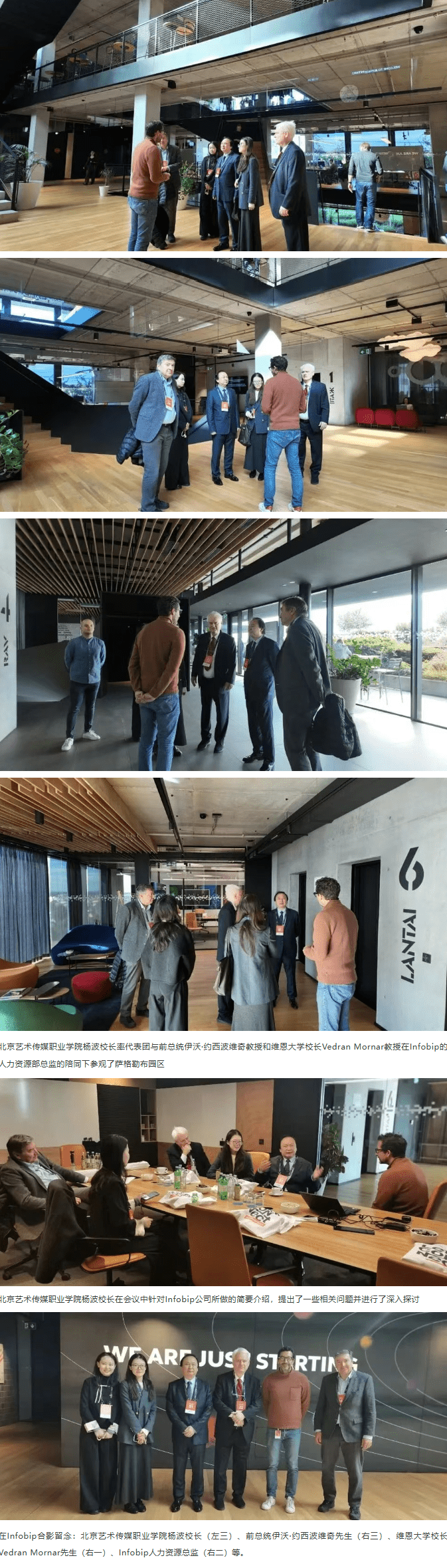 萨格勒布消息:当地时间2025年10月7日上午,在克罗地亚共和国前总统伊沃·约西波维奇的引荐陪同下,杨波校长一行访问位于克罗地亚首都萨格勒布的全球领先云通信平台企业Infobip总部,旨在深入了解全球通信科技前沿发展,共同探索校企合作与人才培养新模式,推动中克两国在高科技领域的交流与合作。维恩大学校长韦德兰·莫尔纳等陪同访问。