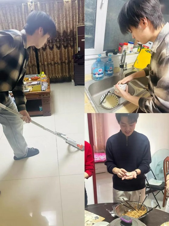 在家庭实践力行中,广大学生主动承担日常家务,坚持打扫卫生、洗衣做饭、整理房间、照料长辈,用实际行动分担家庭辛劳、践行孝亲美德。24 级影视编导冯潇潇为高龄老人剪发、学习家庭消防知识;25 级音乐表演张茜予精进厨艺、规范衣物收纳;24 级戏剧影视表演姚嘉璐、张家瑜每日参与家务、热心帮扶邻里;众多学生在扫地、洗碗、包饺子、整理居所等平凡劳动中体会付出意义,培养吃苦耐劳、感恩尽责的品质。